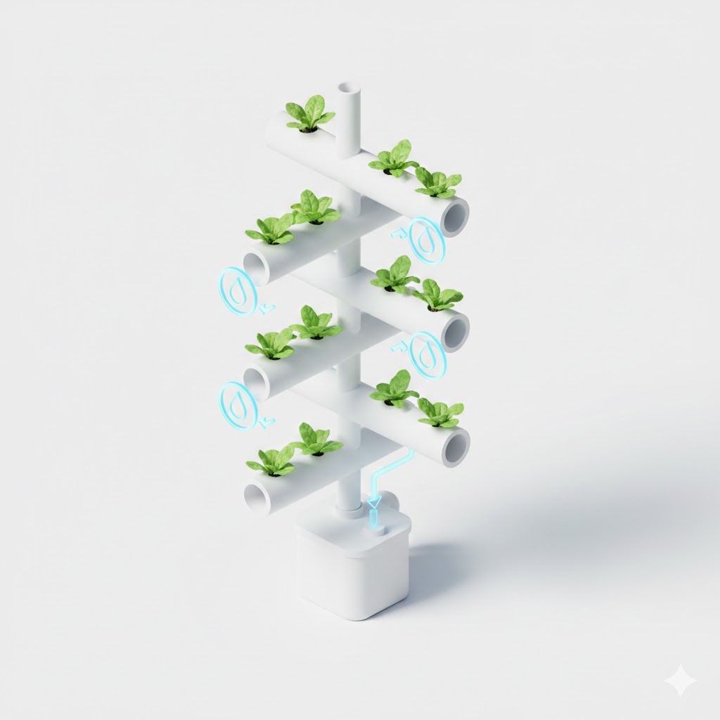 - ระบบน้ำ: ใช้ปั๊มน้ำขนาดเล็กหมุนเวียนสารอาหาร