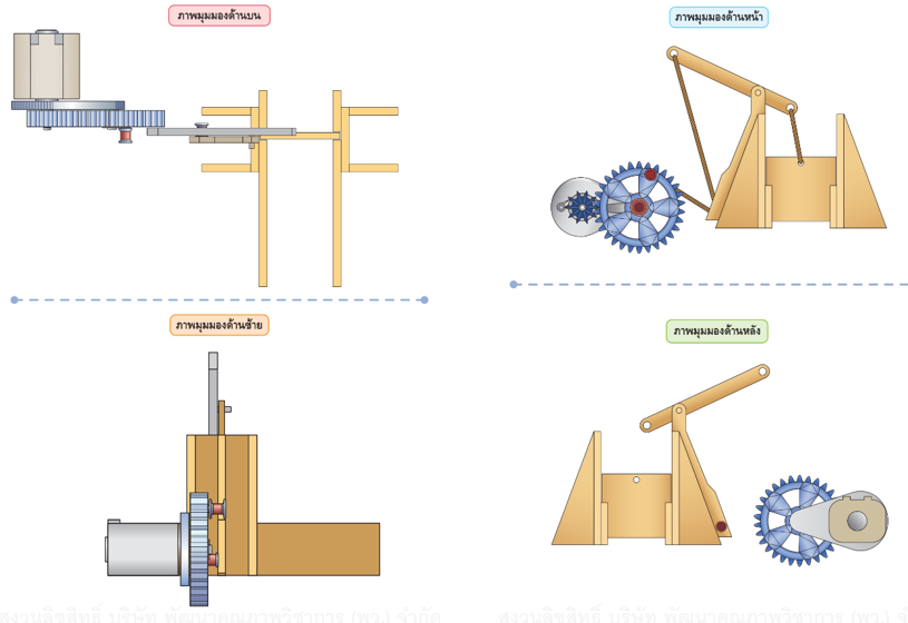 นำชิ้นส่วนฐานตั้งมาประกอบกัน จากนั้นติดตั้ง มอเตอร์ DC และ ชุดเฟือง เข้ากับโครงสร้างให้แน่นหนา ตรวจสอบการขบกันของฟันเฟืองว่าไม่แน่นหรือหลวมจนเกินไป