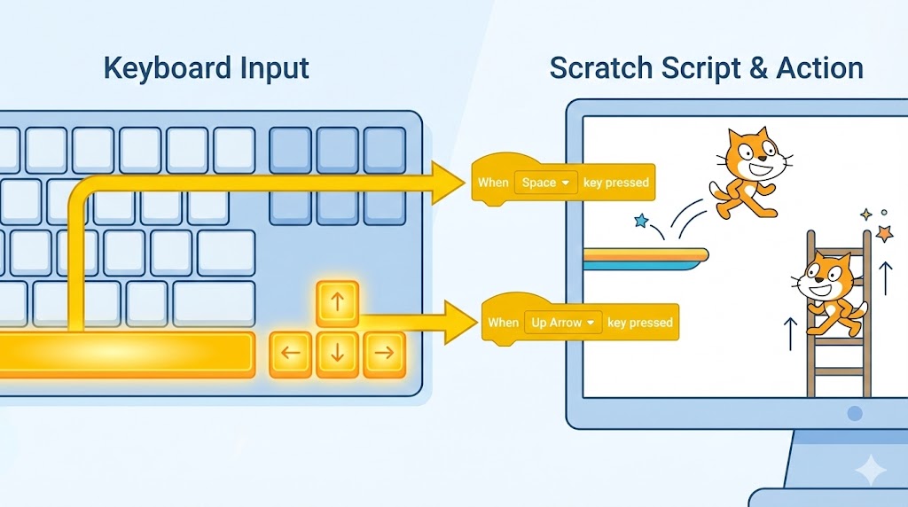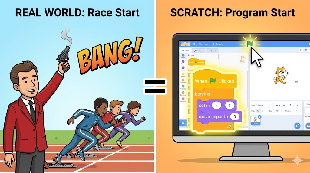 ใน Scratch ก็เหมือนกัน! บล็อกคำสั่งอื่นๆ (เช่น สั่งให้เดิน, สั่งให้พูด) จะนอนหลับนิ่งๆ ไม่ยอมทำงาน จนกว่าจะมีบล็อก Events (เหตุการณ์) มาคอยส่งสัญญาณบอกว่า "เริ่มได้!"