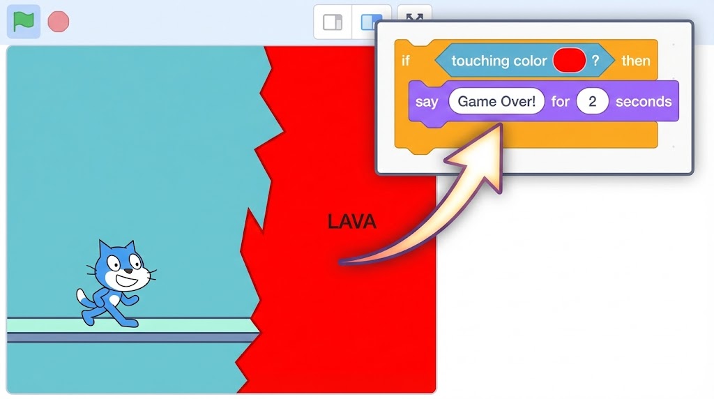 โจทย์: "ถ้าตัวละครเดินชนสีแดง ให้เกมจบ (Game Over)"