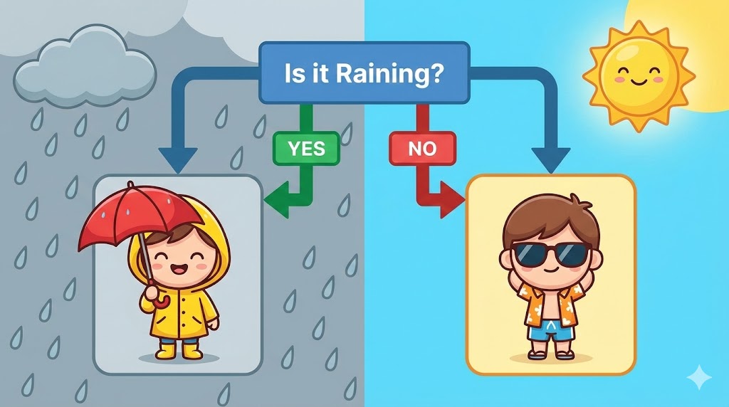 นี่แหละคือ Condition (เงื่อนไข)! มันคือการตรวจสอบสถานการณ์ว่า "จริง" หรือ "ไม่จริง" เพื่อเลือกการกระทำที่ถูกต้อง