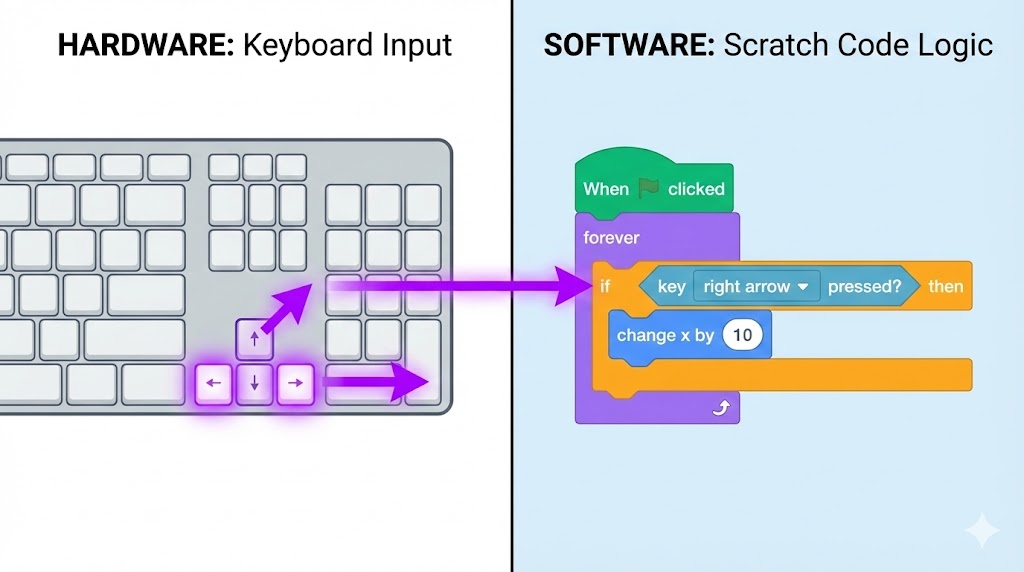 💡 เทคนิค: การใส่ If ไว้ใน Forever จะทำให้โปรแกรมเช็คปุ่มกดตลอดเวลา ทำให้แมวเดินลื่นไหลไม่สะดุดครับ